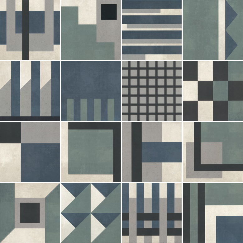 Коллекция состоит из 16-ти керамогранитных декоров, которые поставляются в смешанном виде. Формат 25х25см очень удобен для укладки, как на стены, так и на пол. Матовая, слегка состаренная поверхность отсылает нас к традиционным цементным плиткам - цементину. Материал великолепно подходит для жилых помещений и общественных пространств.